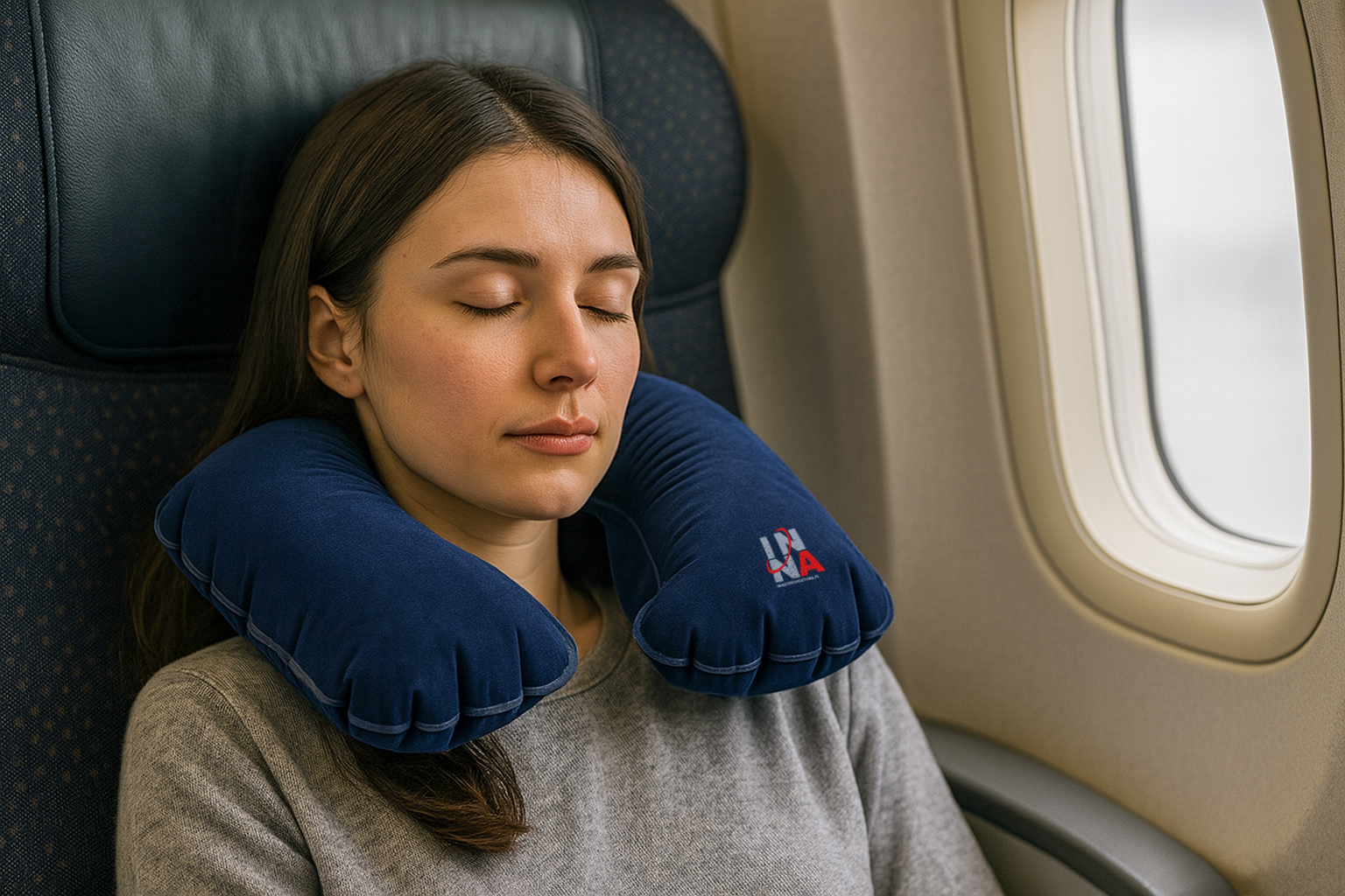 - Zestaw podróżny CINO – nadmuchiwana poduszka, opaska na oczy i stopery w pokrowcu z polem nadruku 80 × 40 mm.