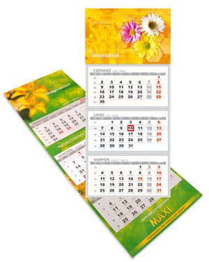 Kalendarz trójdzielny z nadrukiem – praktyczny i zapewniający dużą ilość miejsca na zadruk. W zależności od wersji mogą być zadrukowane od góry do dołu, co pozwala na stworzenie bardzo oryginalnych kreacji lub ekonomicznie – tylko na główce kalendarza, co pozwala wyważyć budżet i reklamę. Użytecznym rozwiązaniem są doklejane kalendaria, które można zrywać po zakończonym miesiącu – zawierają one także okienko wskazujące datę. Dostępne w różnych wersjach: