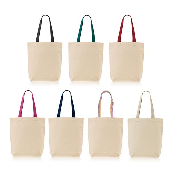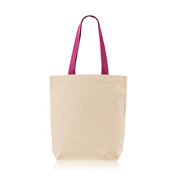 Klasyczna torba bawełniana w naturalnym kolorze z dwoma długimi, kolorowymi uchwytami. Wykonana z grubego, wytrzymałego materiału o gramaturze: 180 g/m². Długość ucha: ok. 57 cm.