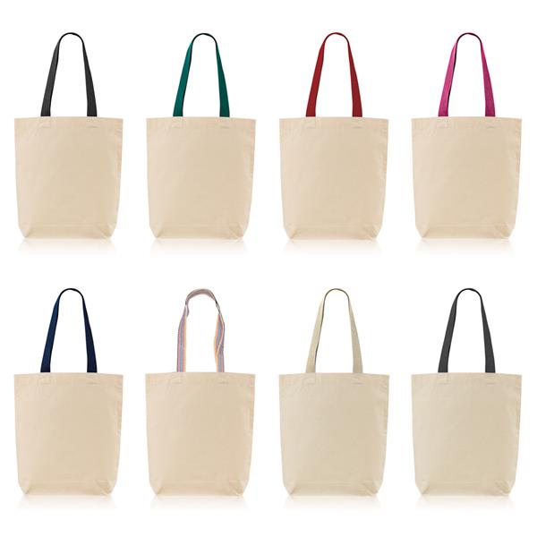 Klasyczna torba bawełniana w naturalnym kolorze z dwoma długimi, kolorowymi uchwytami.