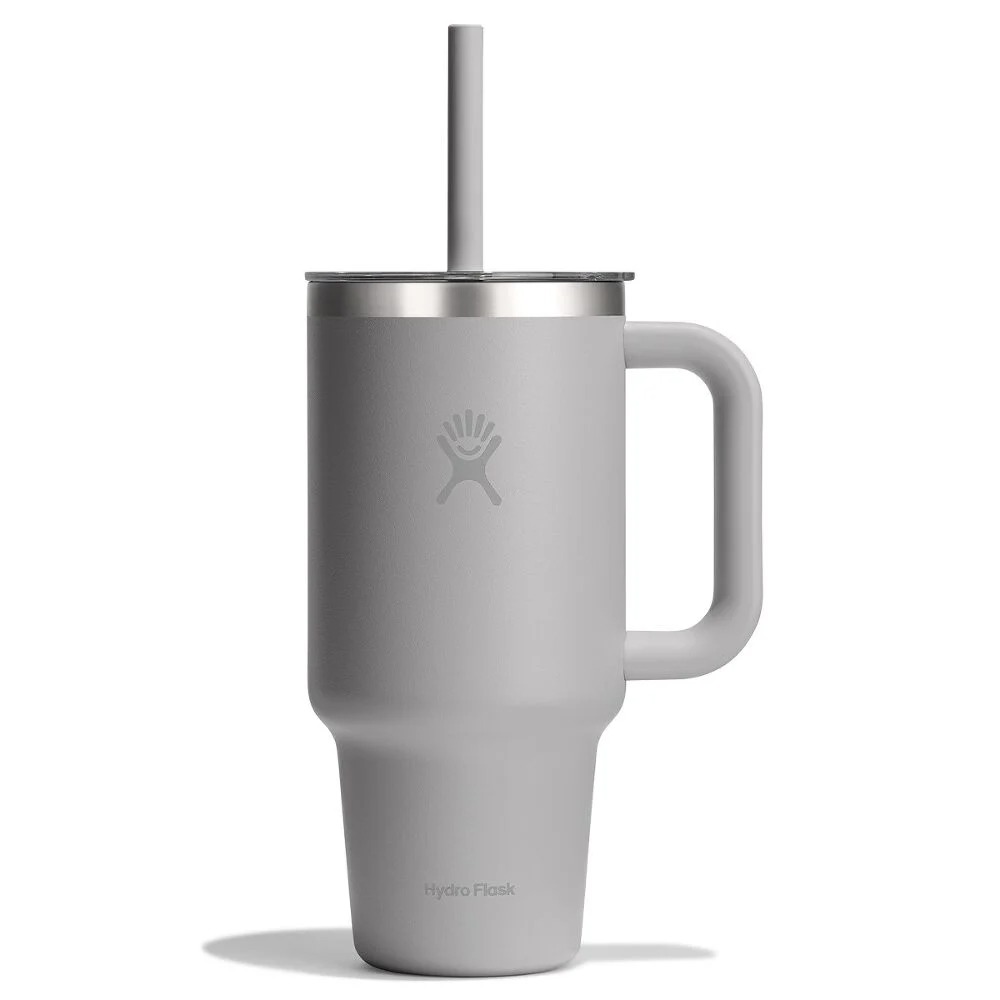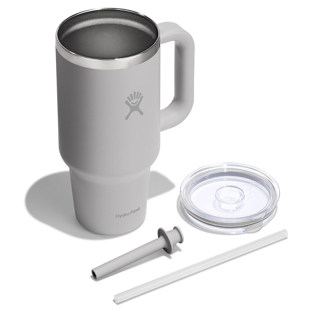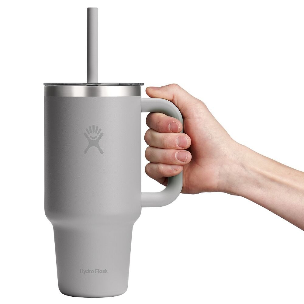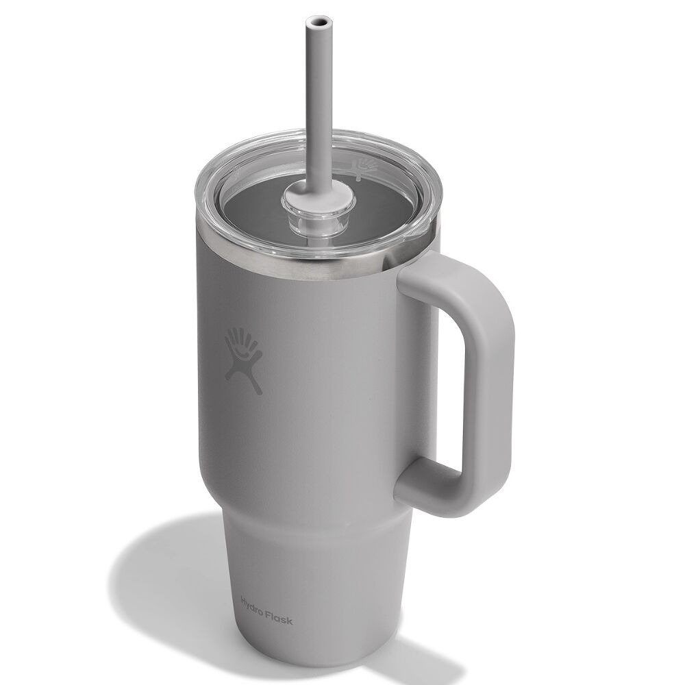 Hydro Flask 946 ml Travel Tumbler to izolowany kubek ze stali nierdzewnej z uchwytem i elastyczną słomką, przeznaczony do zimnych napojów w podróży.