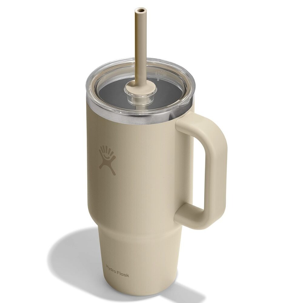Hydro Flask 946 ml Travel Tumbler to izolowany kubek ze stali nierdzewnej z uchwytem i elastyczną słomką, przeznaczony do zimnych napojów w podróży.