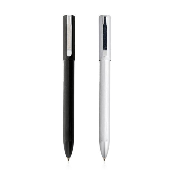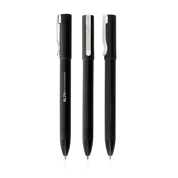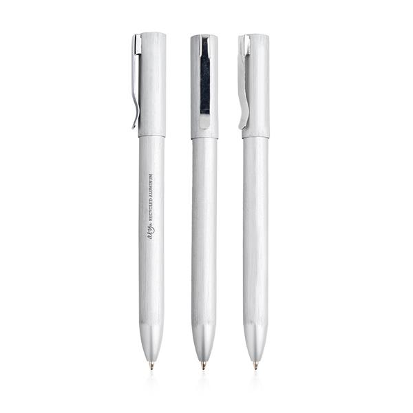 Aluminiowy długopis z recyklingu o ciekawym designie dostępny w dwóch wariantach kolorystycznych.