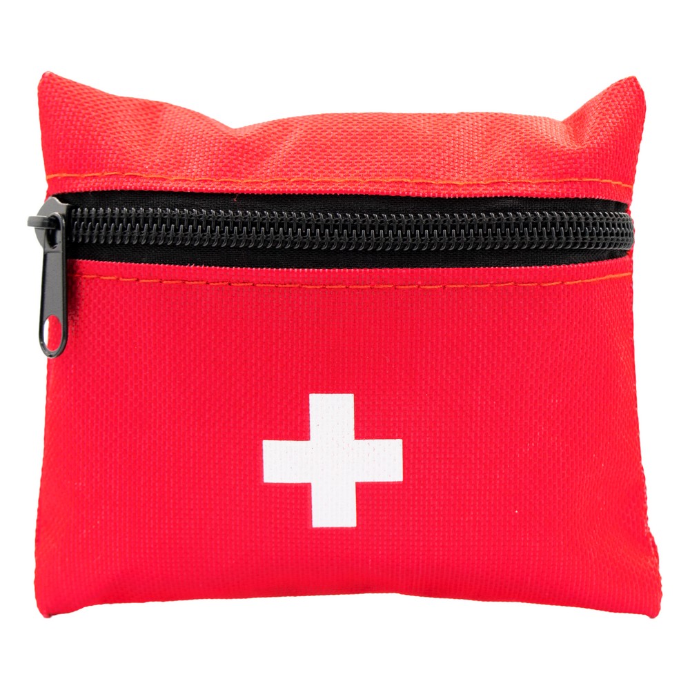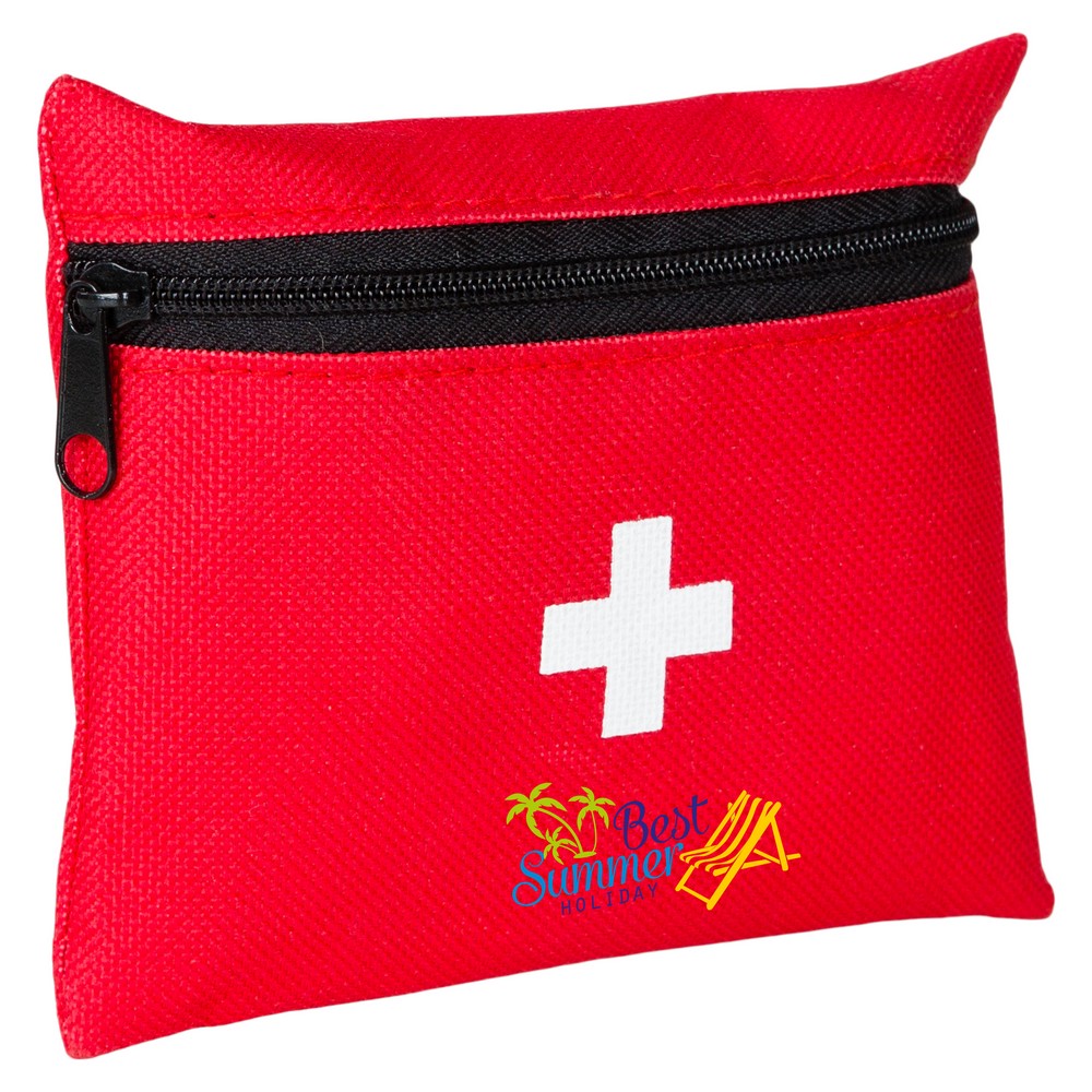 Apteczka w pokrowcu z główną przegrodą na zamek błyskawiczny, zawiera 7 elementów stanowiących wyposażenie apteczki: 10 plastrów, 4 płatki nasączone alkoholem, taśma, 2 nieprzylegające opatrunki, bandaż, patyczki higieniczne (20 szt.) oraz nożyczki, produkt wykonany z poliestru 600D