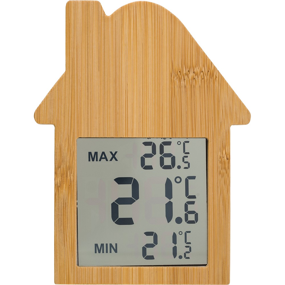 Stacja pogodowa „domek”, wykonana z bambusa, przyssawka z tyłu, funkcje: aktualna temperatura, minimalna temperatura, maksymalna temperatura