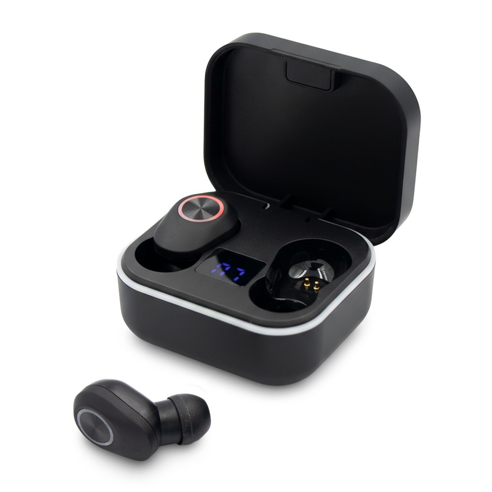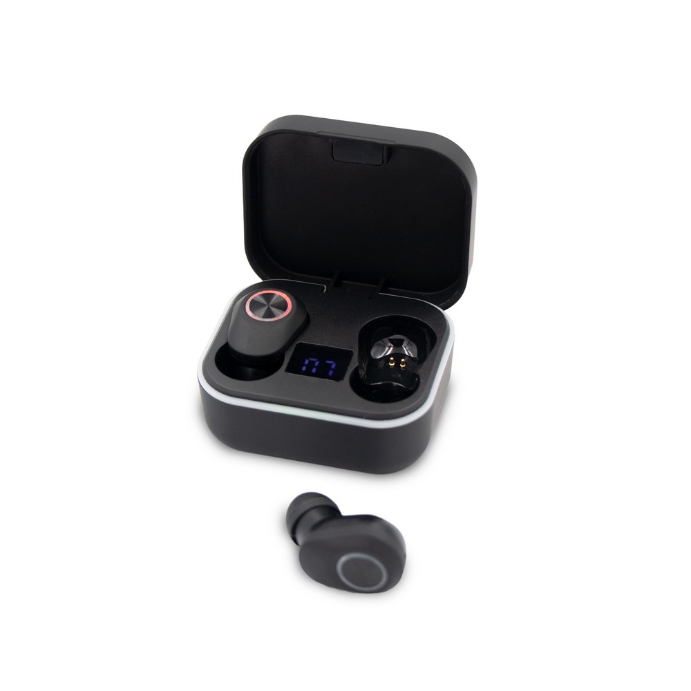 Słuchawki bezprzewodowe 2×40 mAh w etui ze stacją ładującą słuchawki 300 mAh, douszne, BT 5.1, etui ładujące z cyfrowym wskaźnikiem poziomu naładowania etui, funkcja odbierania połączeń, wbudowany mikrofon, ładowane przez USB, czas pracy: >2h, zasięg do 10 m, kabel USB-C w komplecie