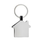 Brelok do kluczy w kształcie domku z kółkiem do przyczepienia kluczy, ikona skóry z recyklingu wytłoczona na produkcie, zapakowany w rękaw z kartonu, produkt wykonany z metalu i PP
