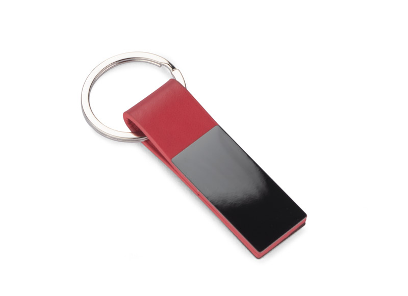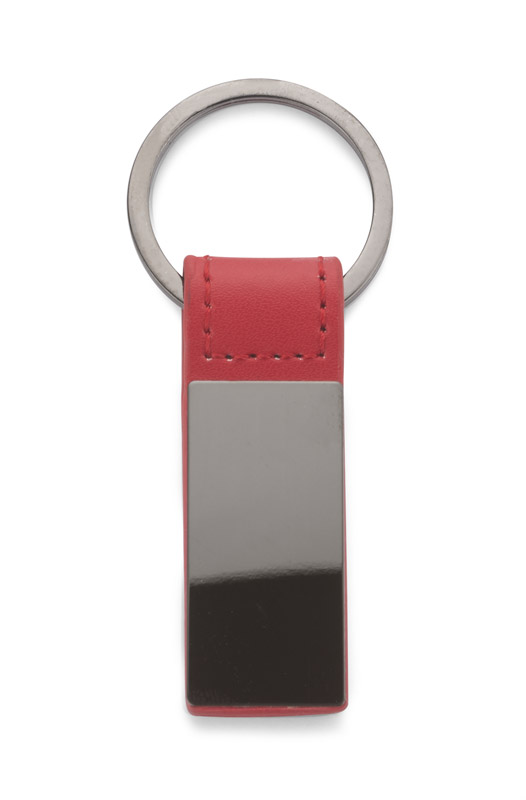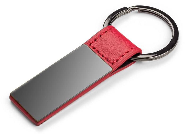 Elegancki dwustronny brelok wykonany z materiału skóropodobnego PU i metalu w kolorze grafitowym.