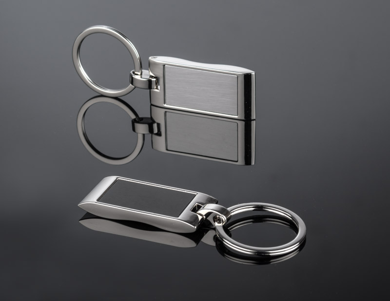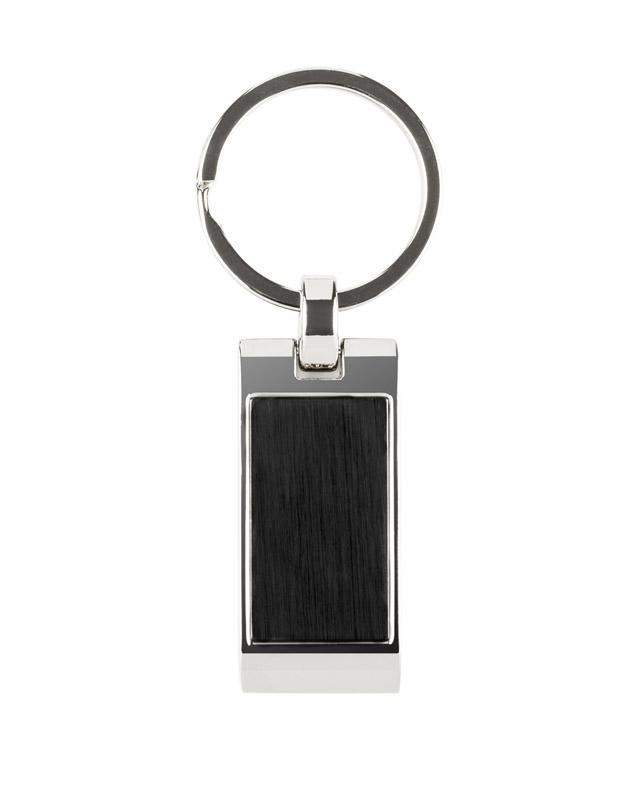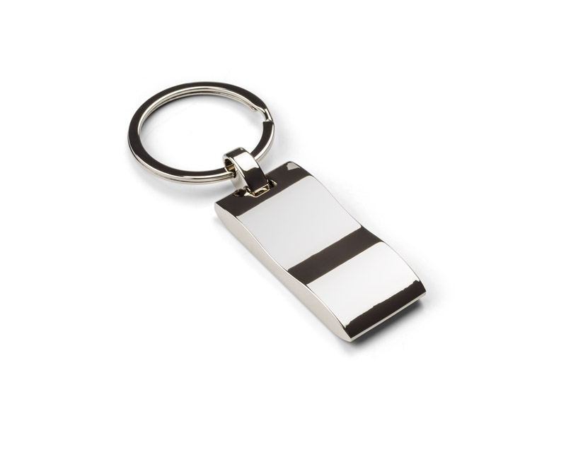 Metalowy brelok do kluczy z prostokątną, falowaną zawieszką.