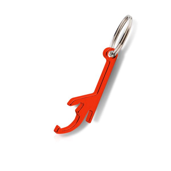 Aluminiowy breloczek w kształcie otwieracza do butelek.