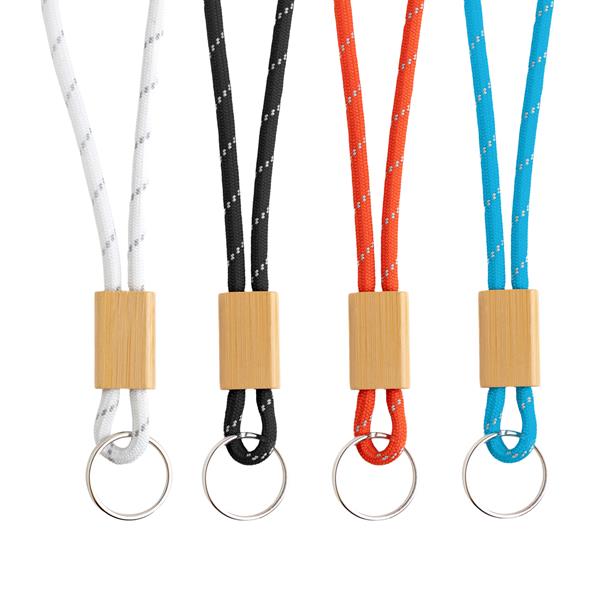 Brelok sznurkowy, regulowany z kółkiem i bambusowym detalem wykonany z poliestru.