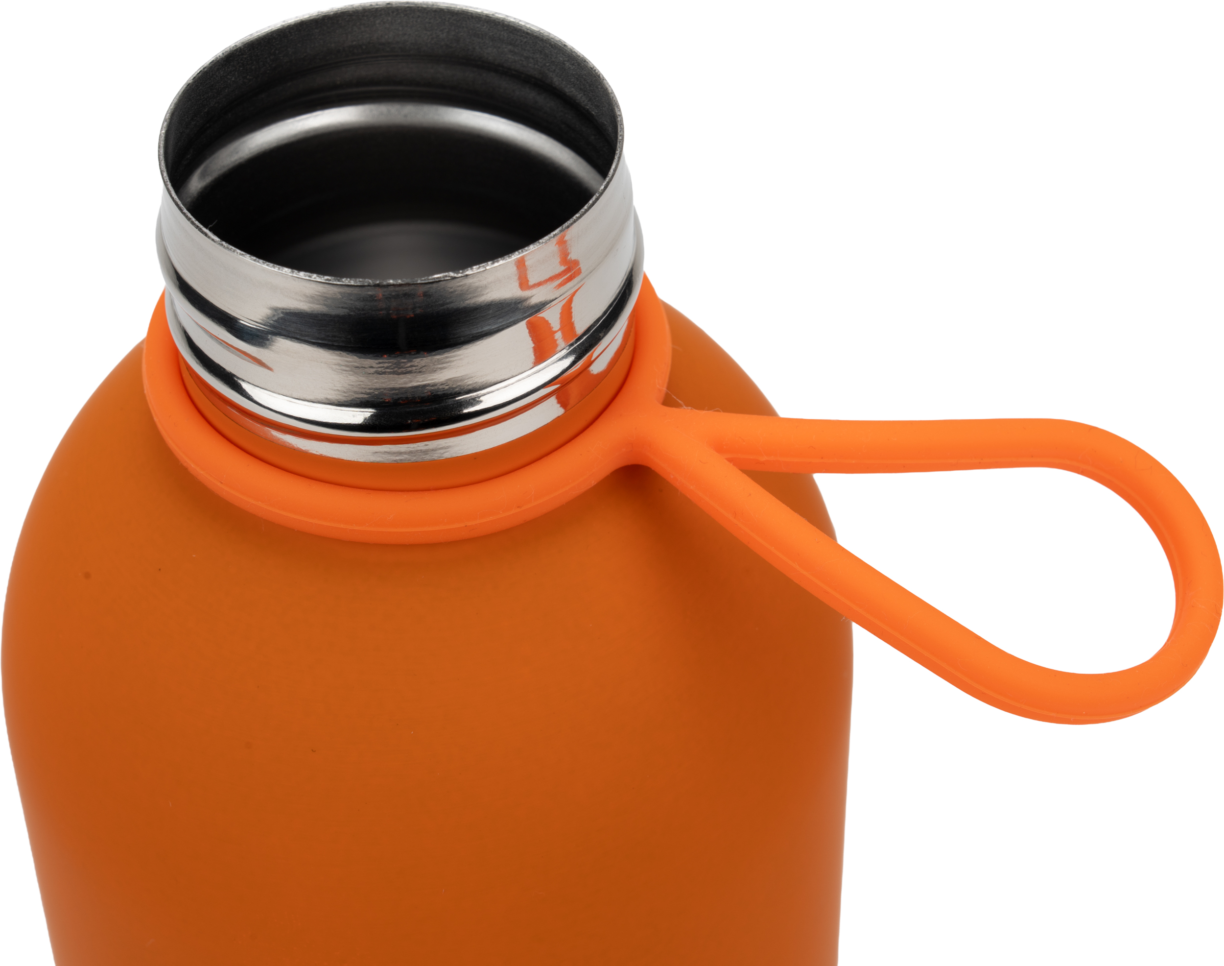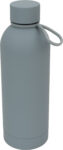 Stalowa butelka z gumowaną powierzchnią oraz pętelką do przenoszenia, o pojemności 800 ml.