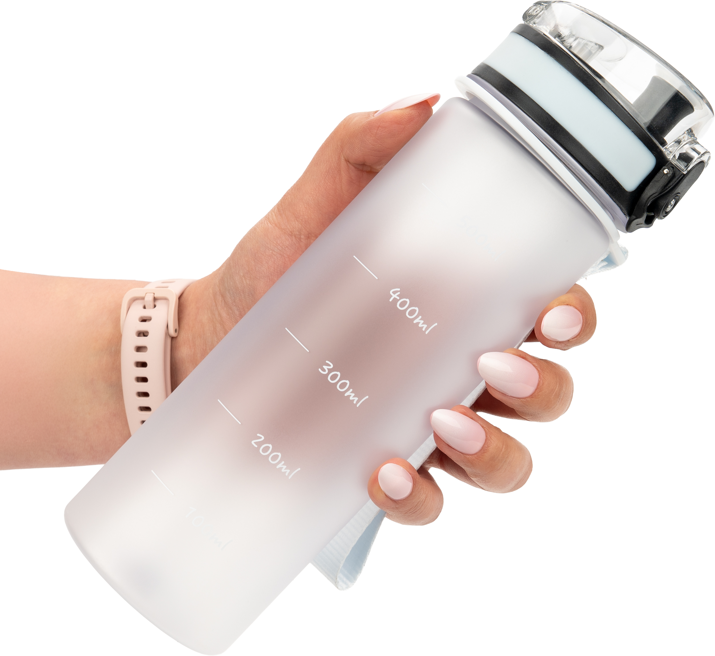 Sportowa butelka do picia, wykonana z Tritanu z powierzchnią soft touch. Butelka posiada wygodne otwieranie na przycisk, pętelkę do noszenia i nadrukowaną miarkę w ml. Pojemność 570 ml.