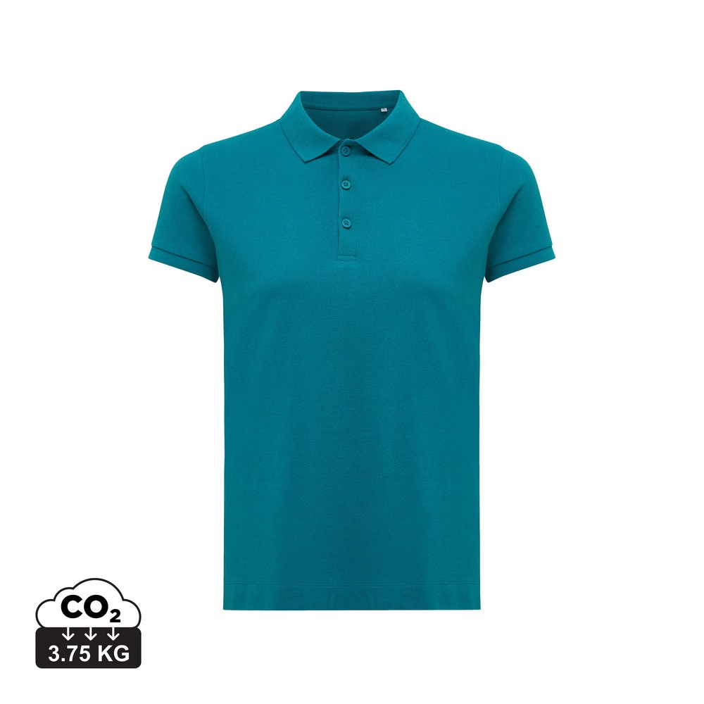 Koszulka polo, damska, zapięcie na 3 guziki, krój medium, splot Pique, krótkie rękawy, wykonana w 50% z bawełny z recyklingu i w 50% z bawełny organicznej o gramaturze 220 g/m2, bez dodatku poliestru, posiada wbudowany znacznik AWARE™, który potwierdza wykorzystanie materiałów z recyklingu, posiada kod QR na metce, który prowadzi do cyfrowego paszportu produktu, 2% wpływów z każdego sprzedanego produktu jest przekazywane na rzecz Water.org