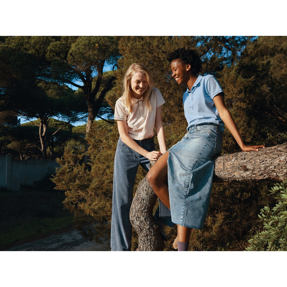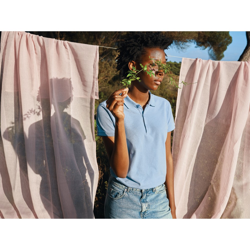Koszulka polo, damska, zapięcie na 3 guziki, krój medium, splot Pique, krótkie rękawy, wykonana w 50% z bawełny z recyklingu i w 50% z bawełny organicznej o gramaturze 220 g/m2, bez dodatku poliestru, posiada wbudowany znacznik AWARE™, który potwierdza wykorzystanie materiałów z recyklingu, posiada kod QR na metce, który prowadzi do cyfrowego paszportu produktu, 2% wpływów z każdego sprzedanego produktu jest przekazywane na rzecz Water.org