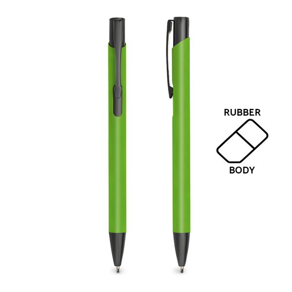 Długopis aluminiowy z gumowaną powierzchnią, z mechanizmem wciskanym, pisze na niebiesko.