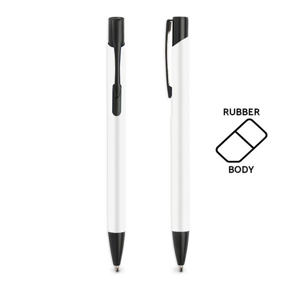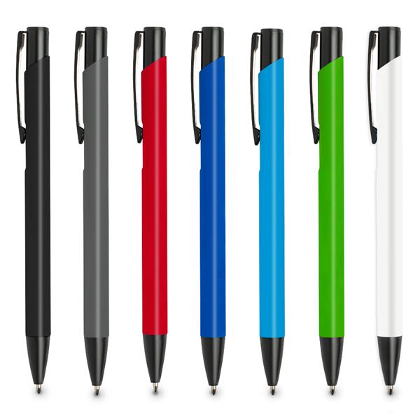 Długopis aluminiowy z gumowaną powierzchnią, z mechanizmem wciskanym, pisze na niebiesko.