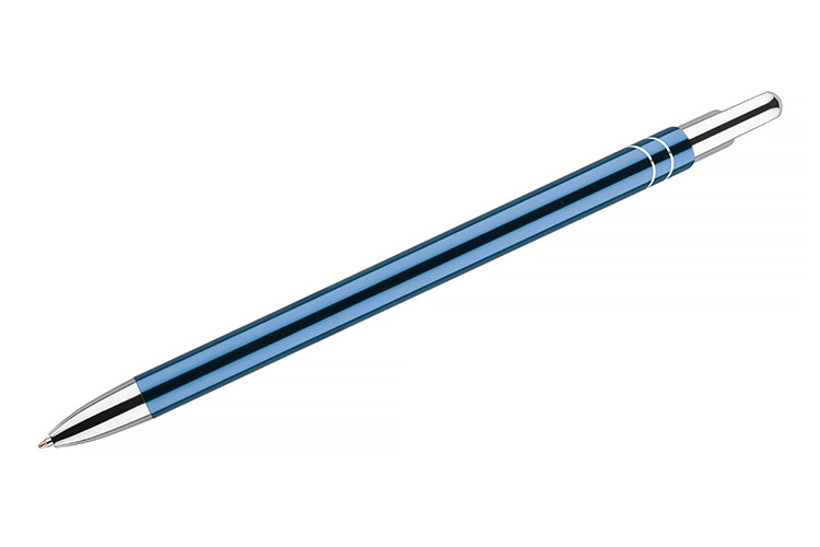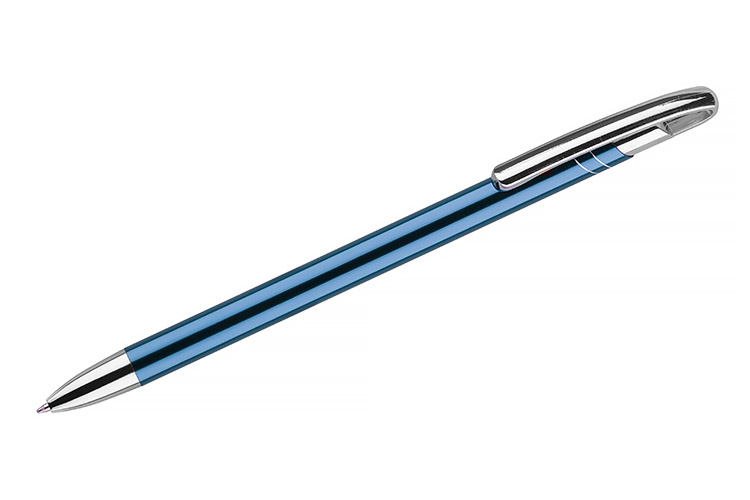 Cienki i zgrabny metalowy długopis w kolorze o metalicznym wykończeniu.