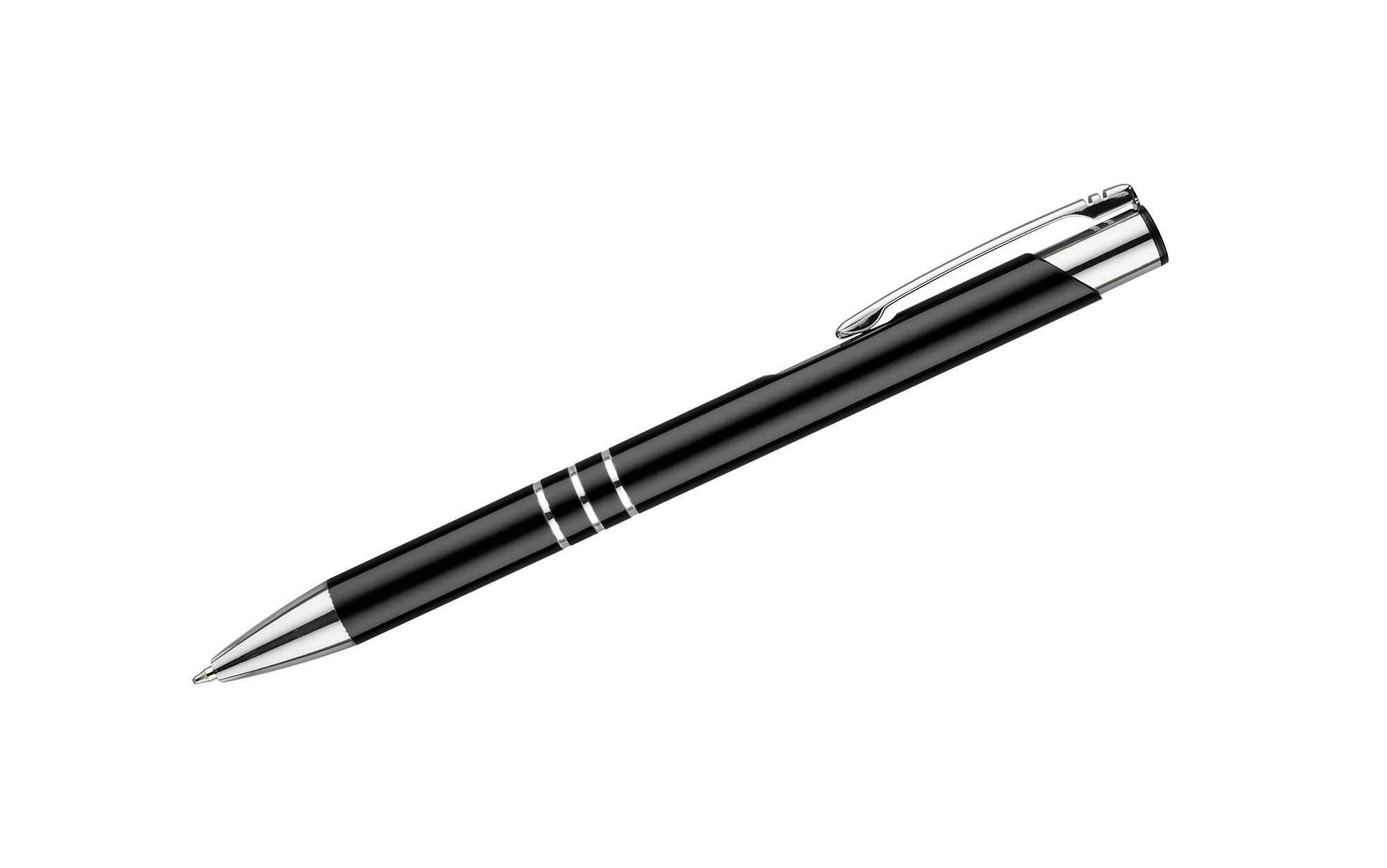 Metalowy długopis o metalizowanej chromowanej powierzchni.