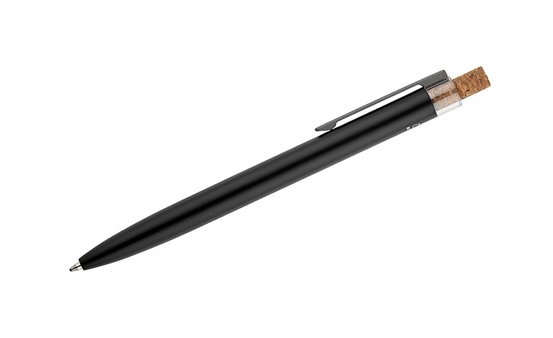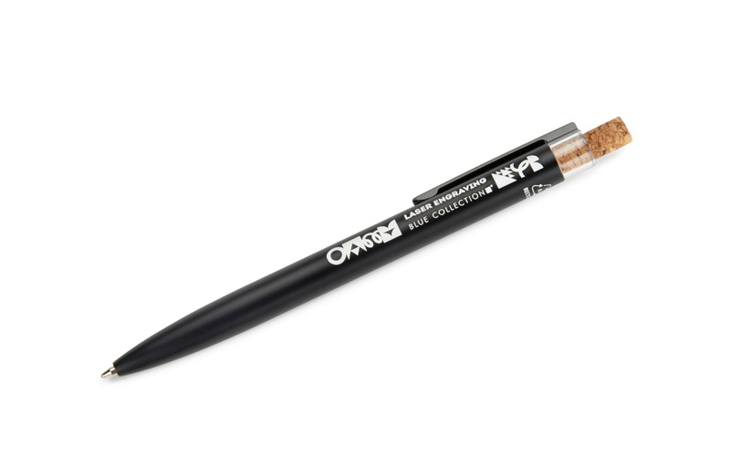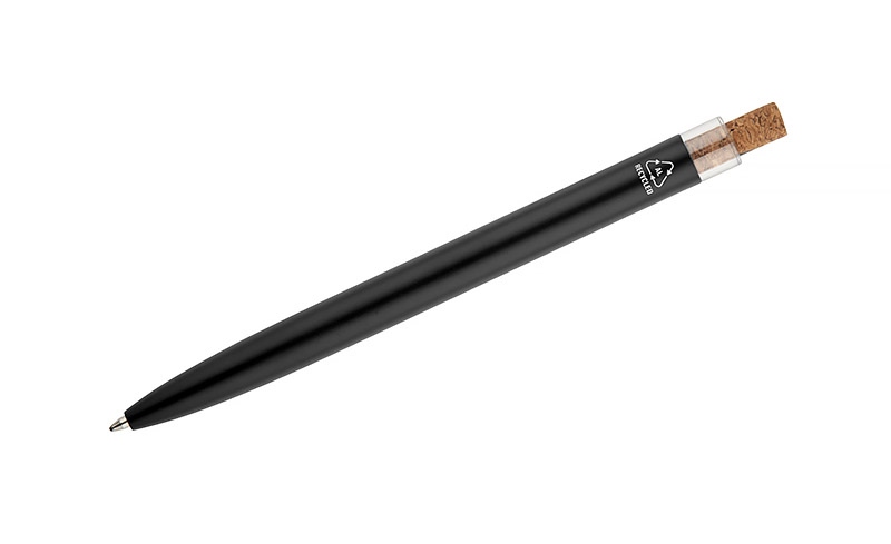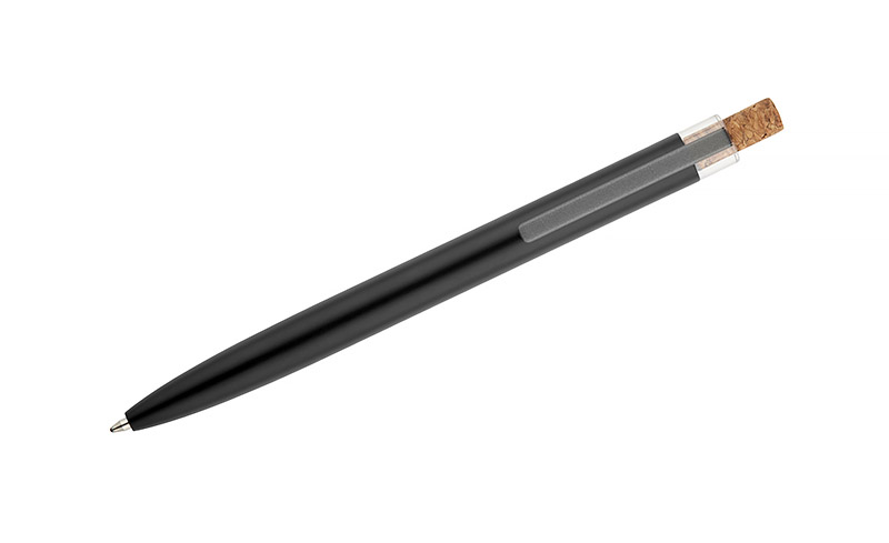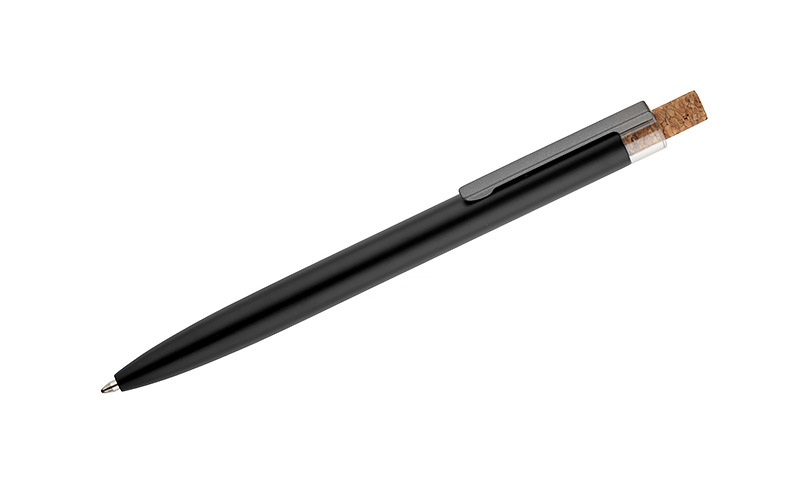 Długopis KORIN wykonany jest z recyklingowanego aluminium i pokryty lakierowanym wykończeniem, które nadaje mu gładką, satynową powierzchnię. Wyposażony w automatyczny mechanizm, wkład typu G2 o grubości pisania 1,0 mm oraz metalowy klips w kolorze grafitowym. Korkowy przycisk stanowi ciekawy akcent, podkreślający nowoczesny charakter długopisu. KORIN jest lekki, solidny i wygodny w codziennym użytkowaniu.