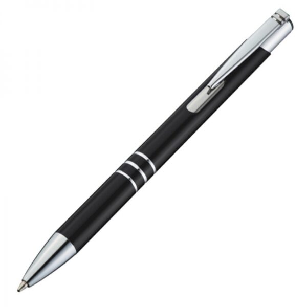 Długopis metalowy to wyjątkowy wybór dla tych, którzy cenią sprawdzone gadżety w atrakcyjnej cenie. Wykonany z aluminium, długopis ten jest dobrze wyważony w dłoni, dzięki czemu możesz nim pisać wygodnie przez dłuższy czas. Jego niebieski wkład zapewnia płynne i wyraźne pisanie, a mechanizm na `klik` gwarantuje szybkie i łatwe wysuwanie wkładu.Długopis charakteryzuje się srebrnym wykończeniem klipsu oraz trzema ringami, które elegancko dekorują jego korpus.
