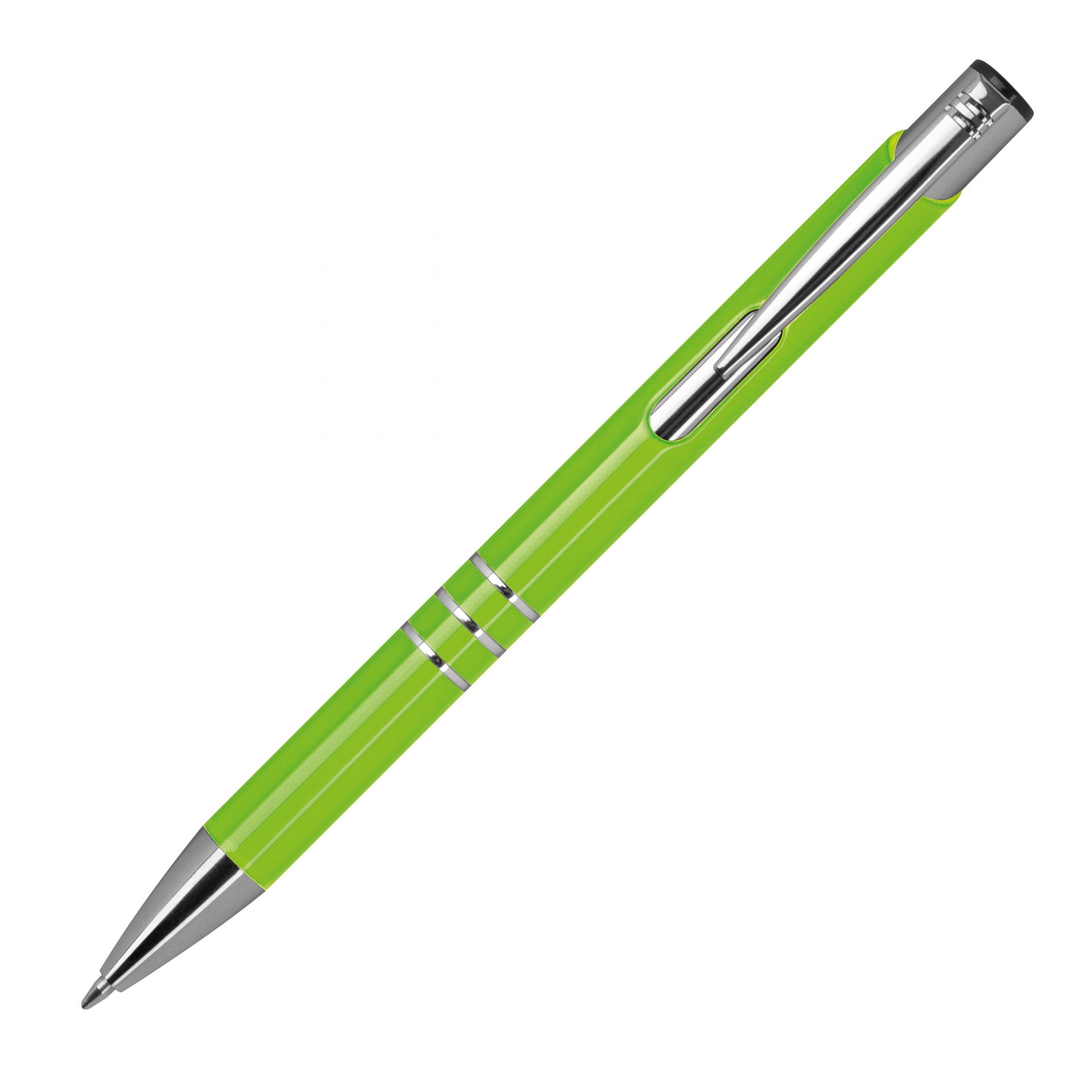 Klasyczny metalowy długopis, popularny wybór jako gadżet reklamowy na rozdanie lub gadżet z logo promujący markę. Wykonany z aluminium, charakteryzuje się srebrnym wykończeniem smukłego klipsu oraz trzema ringami, które elegancko dekorują jego korpus. Długopis sprawdzi się zarówno w biurze, jak i podczas spotkań biznesowych.Mechanizm na `klik` zapewnia szybkie i łatwe wysuwanie wkładu, co czyni go wygodnym i praktycznym narzędziem do codziennego użytku.