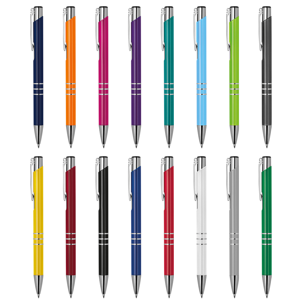 Klasyczny metalowy długopis, popularny wybór jako gadżet reklamowy na rozdanie lub gadżet z logo promujący markę. Wykonany z aluminium, charakteryzuje się srebrnym wykończeniem smukłego klipsu oraz trzema ringami, które elegancko dekorują jego korpus. Długopis sprawdzi się zarówno w biurze, jak i podczas spotkań biznesowych.Mechanizm na `klik` zapewnia szybkie i łatwe wysuwanie wkładu, co czyni go wygodnym i praktycznym narzędziem do codziennego użytku.