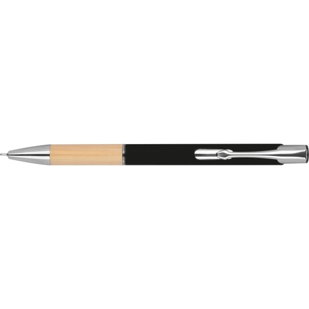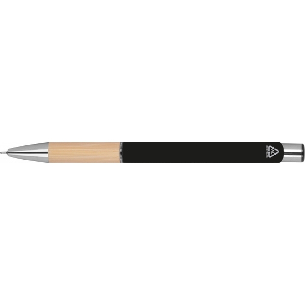 Piszący na niebiesko, półżelowy długopis wykonany z aluminium pochodzącego z recyklingu ze srebrnymi elementami i bambusową strefą uchwytu.