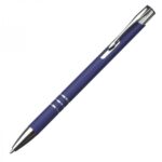 Metalowy długopis z gumową powierzchnią, piszący na niebiesko.