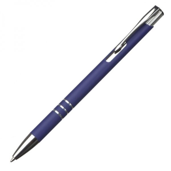 Metalowy długopis z gumową powierzchnią, piszący na niebiesko.