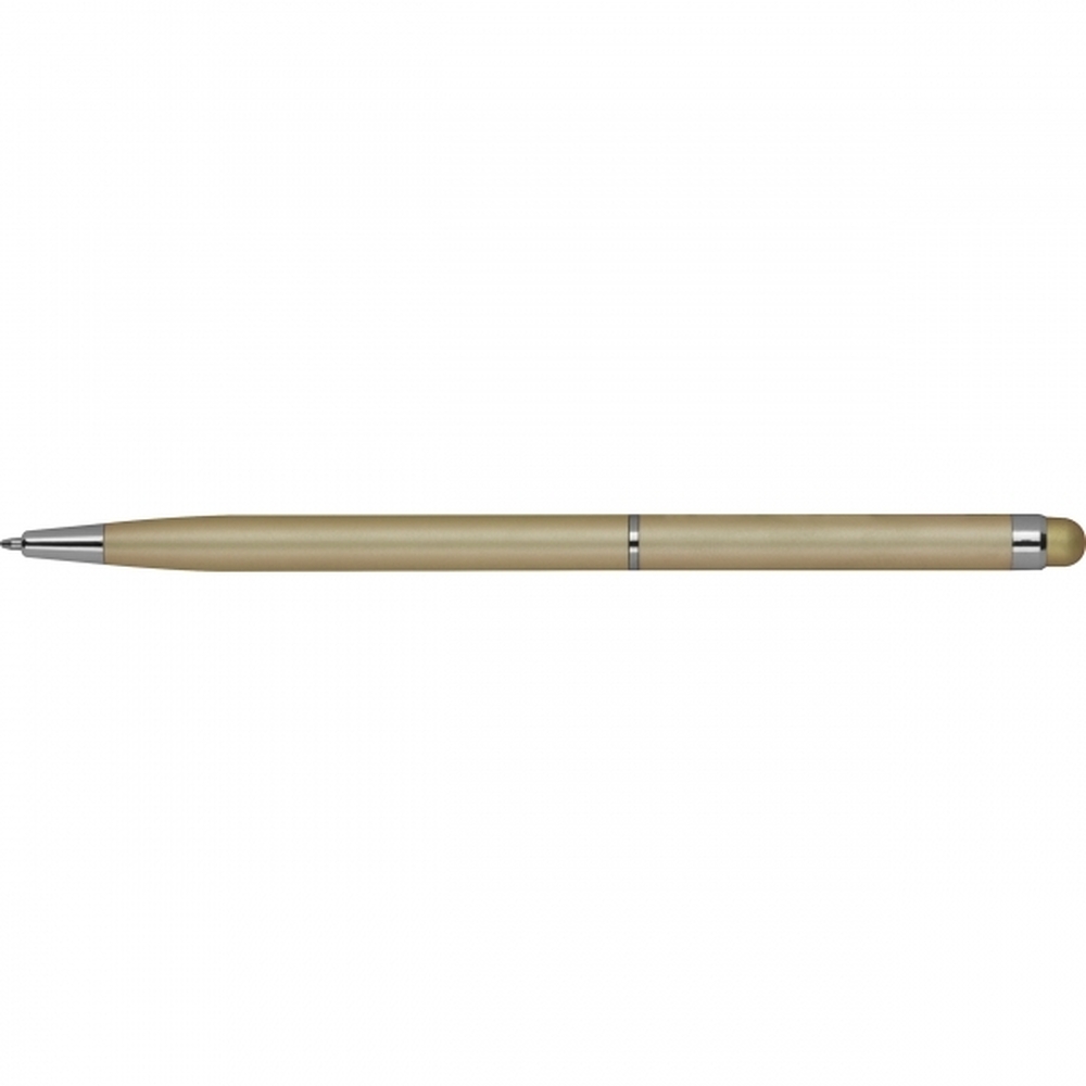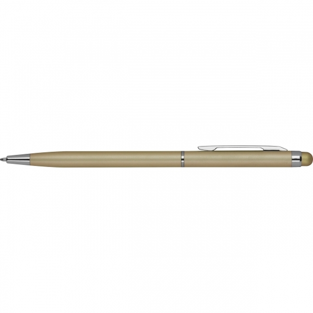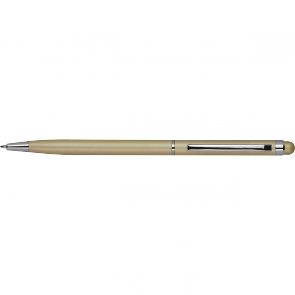 Metalowy długopis z niebieskim wkładem z tworzywa sztucznego i dopasowaną kolorystycznie funkcją dotykową nad klipsem.