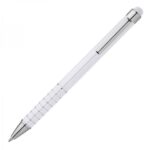 Długopis metalowy z mechanizmem obrotowym i gumką do obsługi ekranów dotykowych.