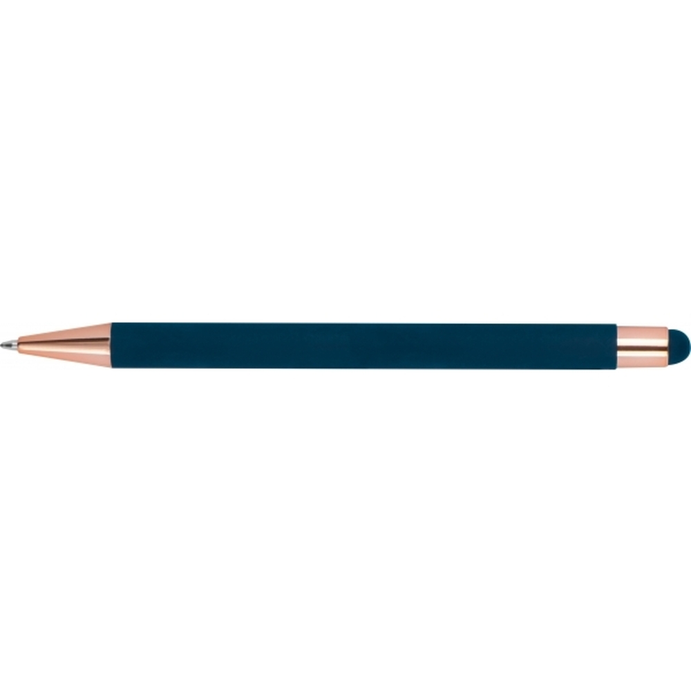 Metalowy długopis z powierzchnią soft touch, różowo złotymi elementami, niebieskim wkładem i końcówką touch pen.