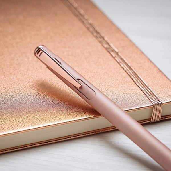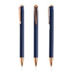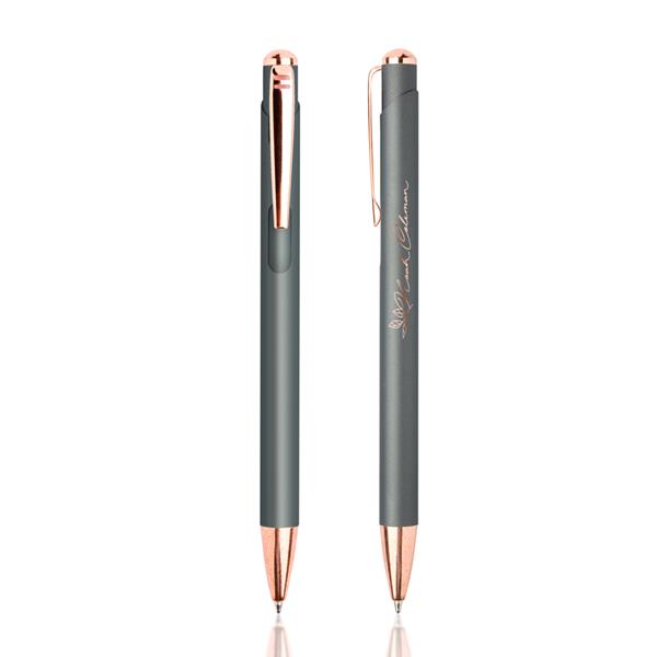 Zachwycający metalowy długopis w nowoczesnym stylu glamour. Dostępny w bogatej gamie kolorystycznej. Długopis charakteryzuje się powierzchnią soft touch, posiada zdobienia w złotym odcieniu oraz załączony niebieski wkład piszący. Idealny do laserowego grawerowania – otrzymujemy w ten sposób błyszczące znakowanie
