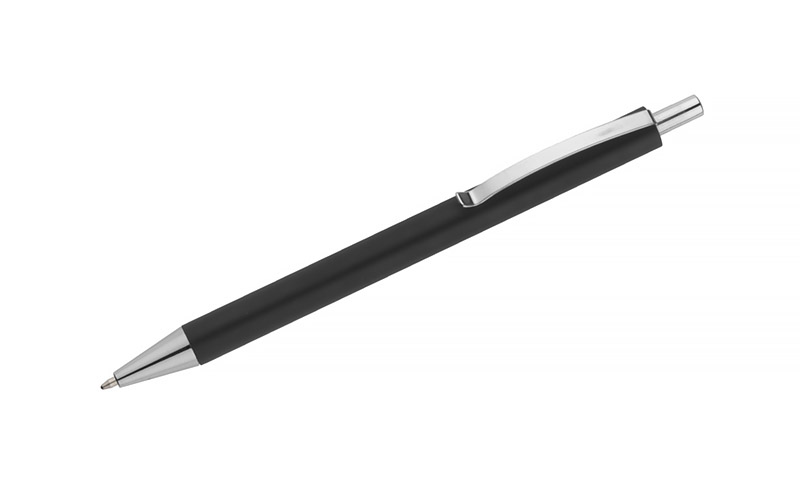 Długopis NOVI wykończony przyjemna w dotyku gumowana powierzchnią z chromowanymi elemantami w kolorze srebrnym.