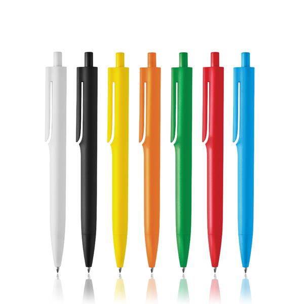 Długopis plastikowy w jednolitym kolorze, z mechanizmem wciskanym, pisze na niebiesko.