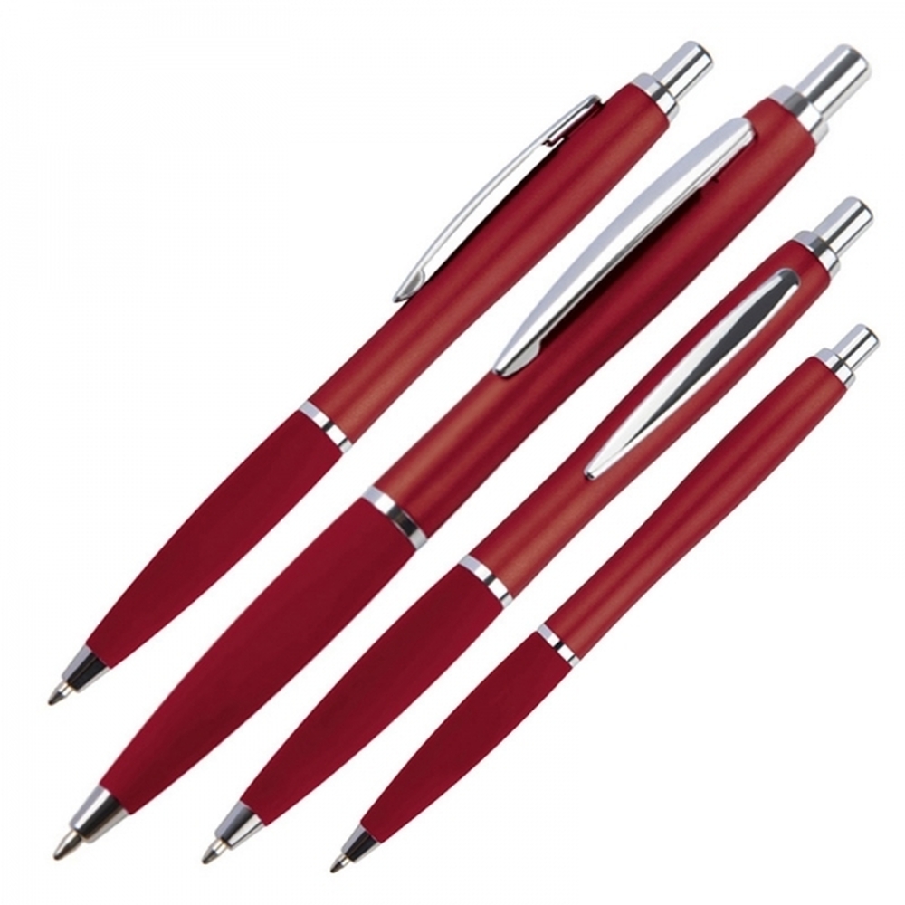 Plastikowy długopis z wkładem piszącym na niebiesko. Posiada gumowaną strefę chwytu.