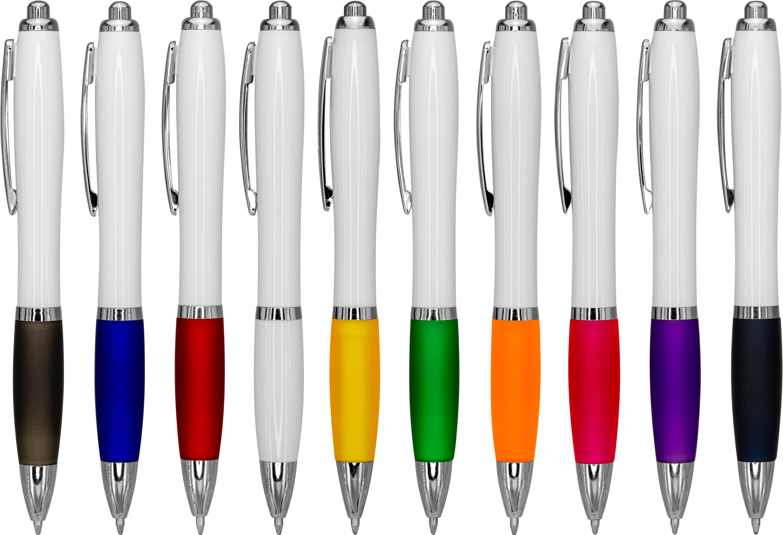 Plastikowy długopis z białym korpusem i kolorową gumką ułatwiającą trzymanie.