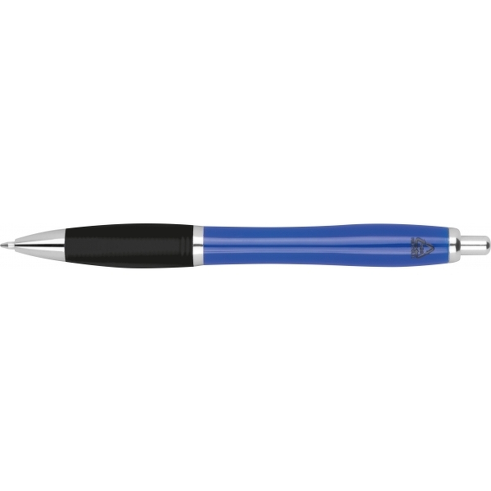 Plastikowy długopis z gumową strefą uchwytu oraz dużym niebieskim wkładem.