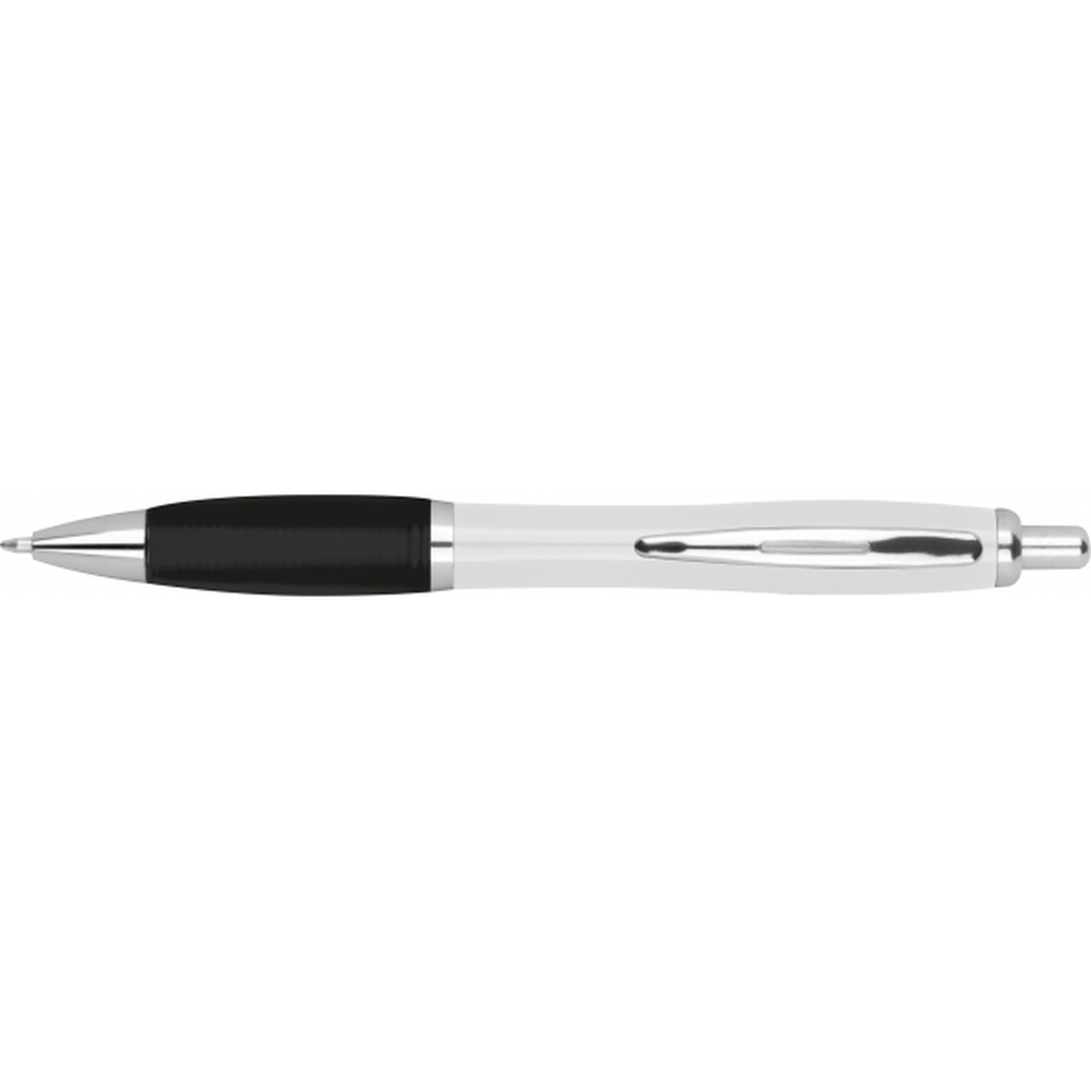 Plastikowy długopis z gumową strefą uchwytu oraz dużym niebieskim wkładem.