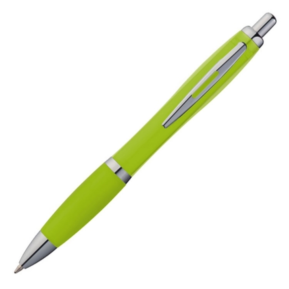 Długopis plastikowy z antypoślizgową gumką oraz z błyszczącymi elementami. Wyposażony w system typu kilk oraz wkład w kolorze niebieskim. Długopis dostępny w bogatej gamie kolorystycznej.