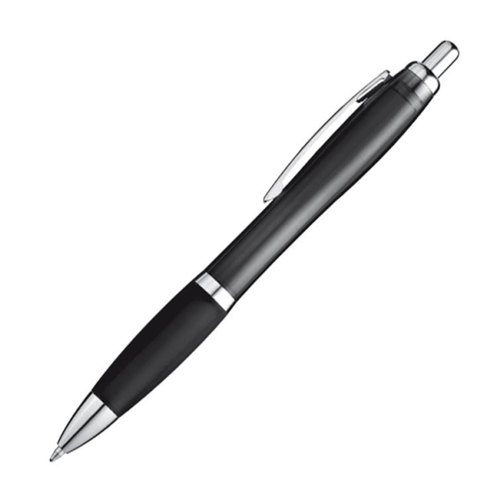 Długopis plastikowy z antypoślizgową gumką oraz z błyszczącymi elementami. Wyposażony w system typu kilk oraz wkład w kolorze niebieskim. Długopis dostępny w bogatej gamie kolorystycznej.