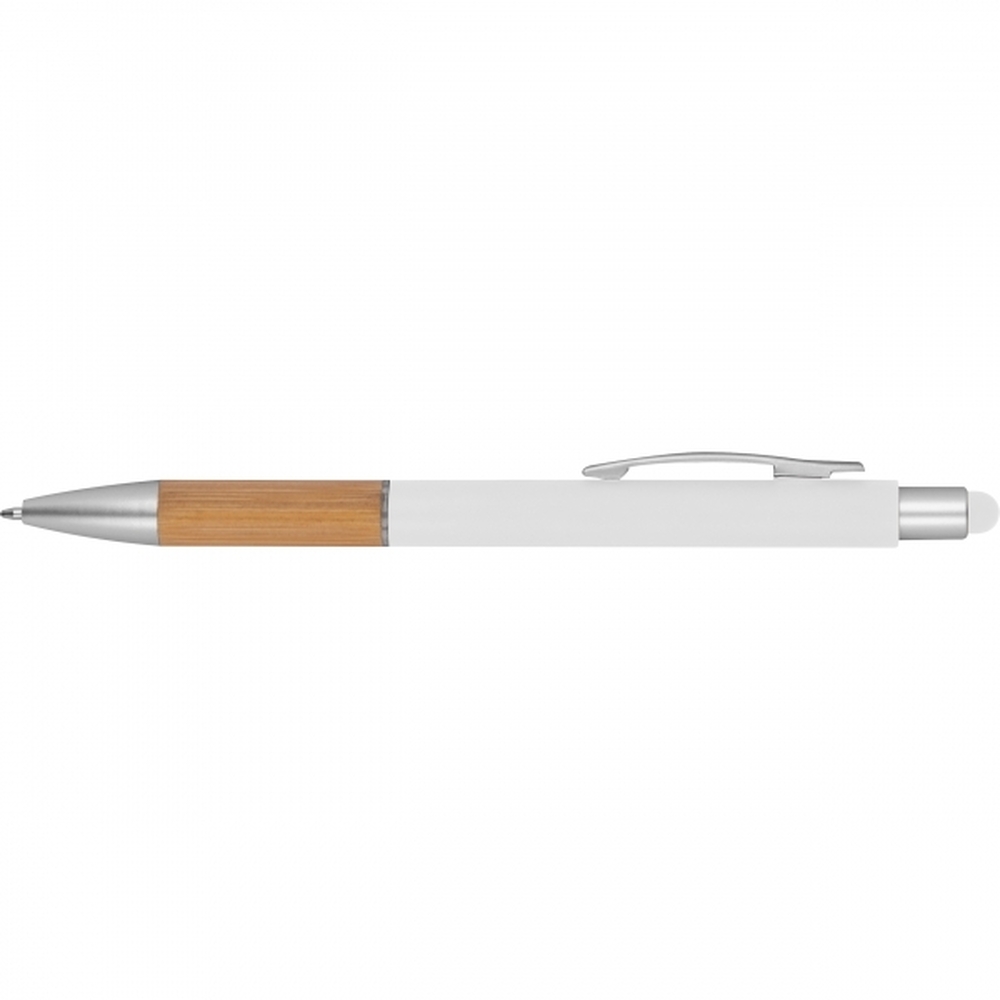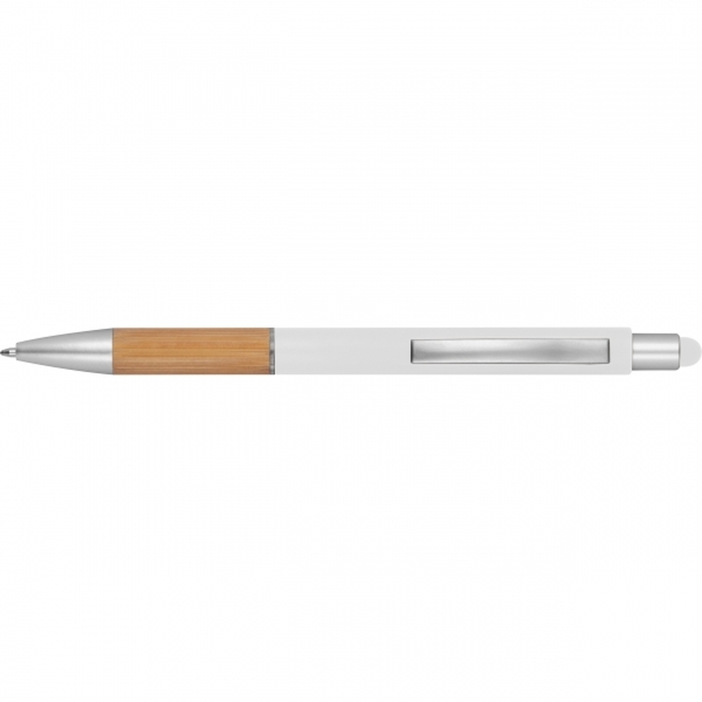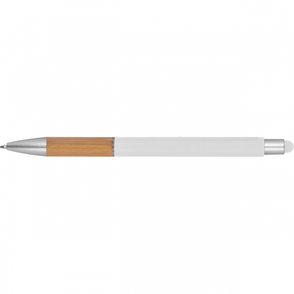 Długopis wykonany z plastiku z bambusową strefą uchwytu, funkcją touch pen do obsługi ekranów dotykowych.