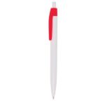 Plastikowy długopis z kolorowym klipsem, z mechanizmem wciskanym, pisze na czarno.
