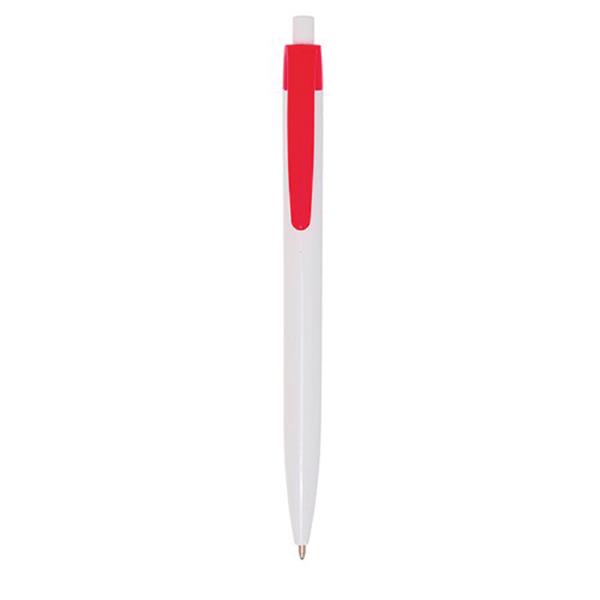 Plastikowy długopis z kolorowym klipsem, z mechanizmem wciskanym, pisze na czarno.