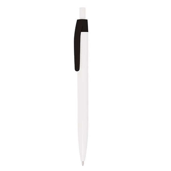 Plastikowy długopis z kolorowym klipsem, z mechanizmem wciskanym, pisze na czarno.