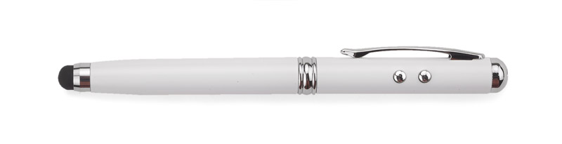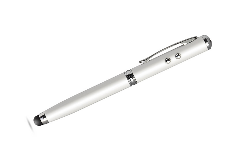 Długopis wykonany z metalu łączący aż cztery praktyczne funkcje: długopis, touch pen, wskaźnik laserowy, latarka.