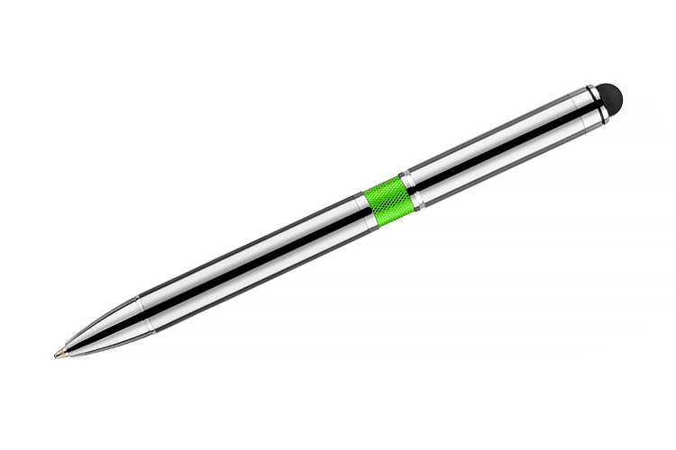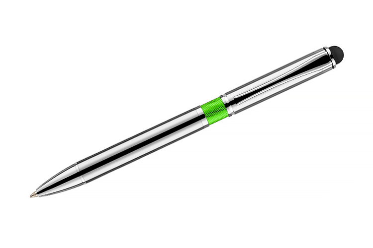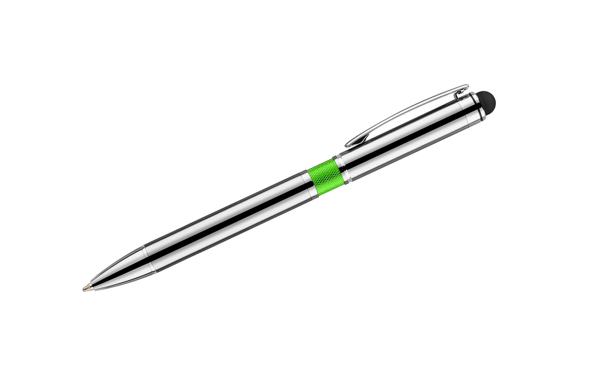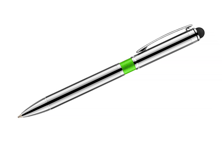 Elegancki metalowy długopis z kolorową aplikacją na korpusie oraz touchpenem.
