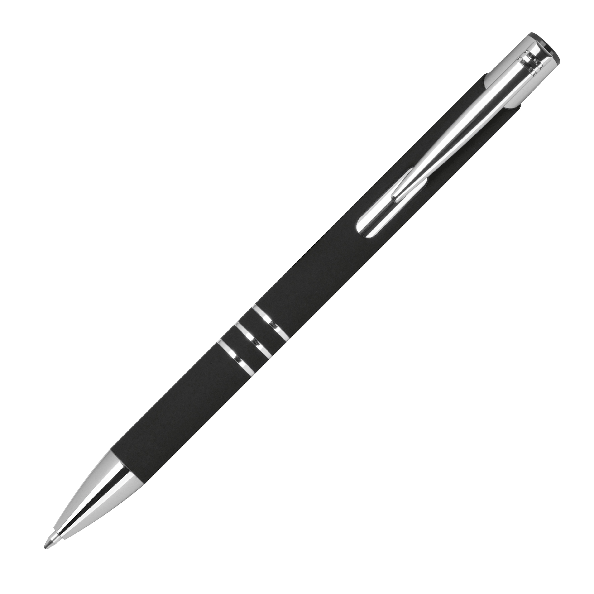 Długopis charakteryzuje się srebrnym wykończeniem klipsu oraz trzema ringami, które elegancko dekorują jego korpus. Powłoka długopisu typu soft touch jest przyjemna w dotyku i umożliwia wykonanie na nim precyzyjnego grawera, dzięki czemu gadżet ten idealnie nadaje się do promowania marki.Cechy ogólne:Długopis półżelowy.Grubość kreski ok. 0,7 mm.Materiał: aluminimum.