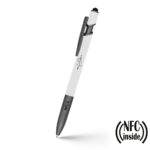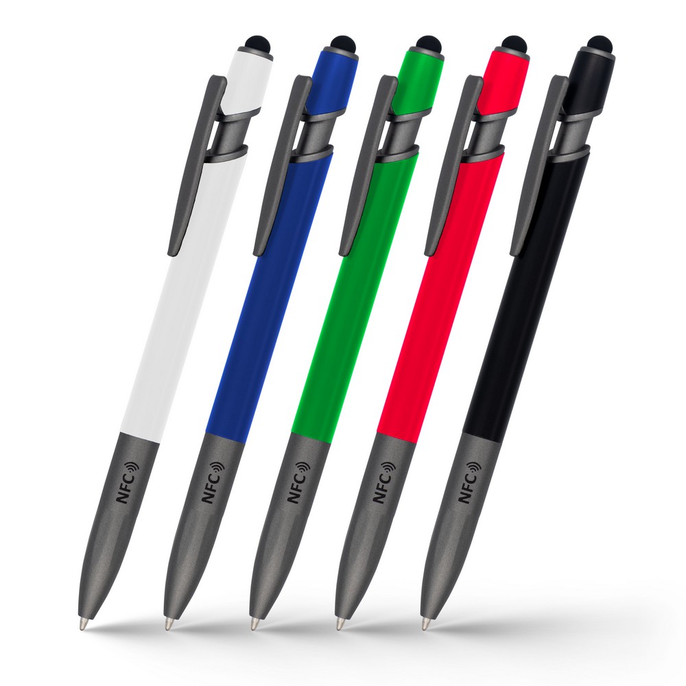 Długopis z chipem NFC (Near Field Communication), działa z urządzeniami posiadającymi technologię NFC, posiada matowy trzon o gumowym wykończeniu i elementy w grafitowym kolorze, końcówka touch pen umożliwia obsługę ekranów dotykowych, wkład w niebieskim kolorze, grawer ukazuje lśniącą powierzchnię. NFC to międzynarodowy standard komunikacji bezprzewodowej wymiany danych na niewielkie odległości. Umieszczony w długopisie chip umożliwia zapisanie na nim np. adresu strony internetowej, który zostanie odczytany przez urządzenie z technologią NFC po zbliżeniu go do logotypu NFC znajdującego się na produkcie. Produkt wykonany z aluminium z recyklingu oraz plastiku.